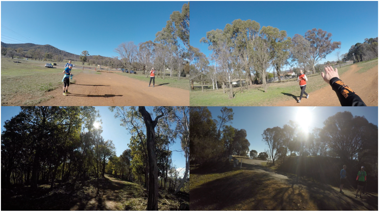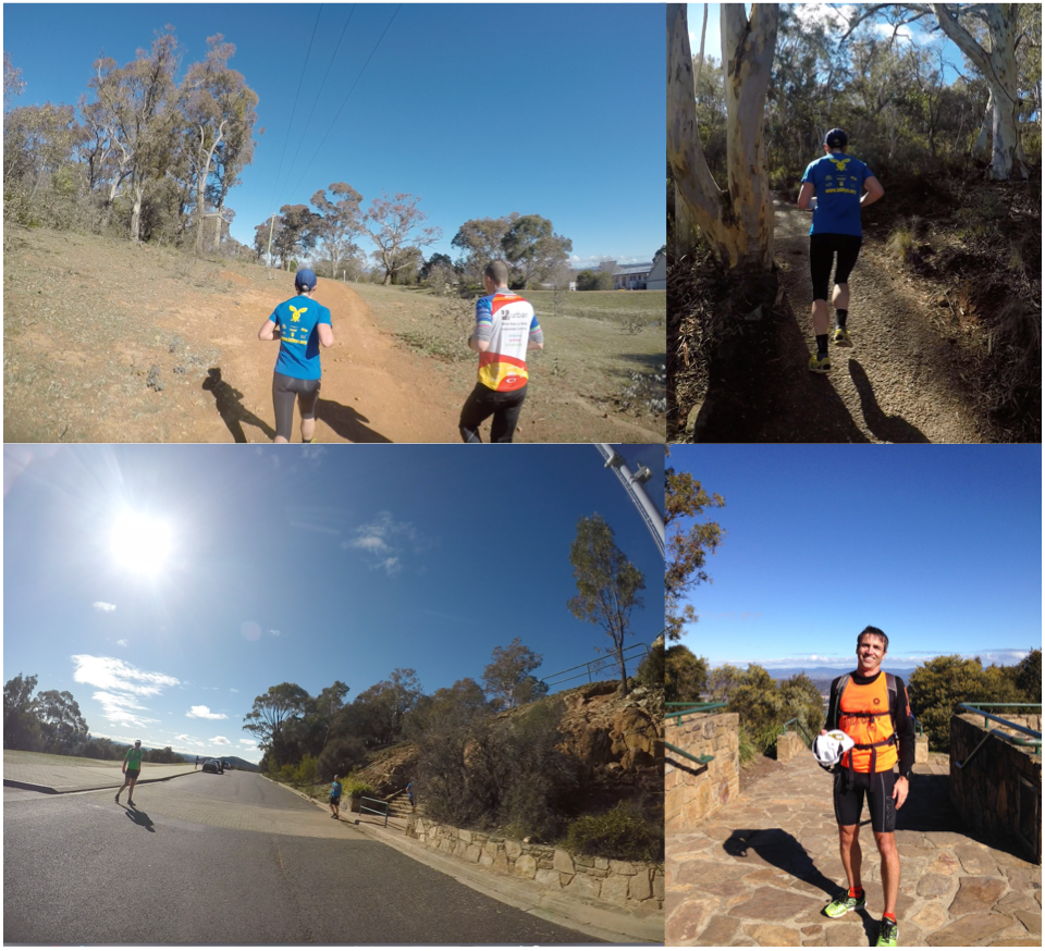 I was feeling quite strong at this stage and ran almost comfortably to the top of Mount Majura. We got cheered by a couple of runners that recognised Kylie and Guy and shouted “Go Bilbys!”. I still don’t know if I never met them or if I simply didn’t recognise them. If the later is true, I’ll blame my focus on the run for that. Mount Majura conquered! Quick stop for photos, energy bar, and changing my GoPro battery.
