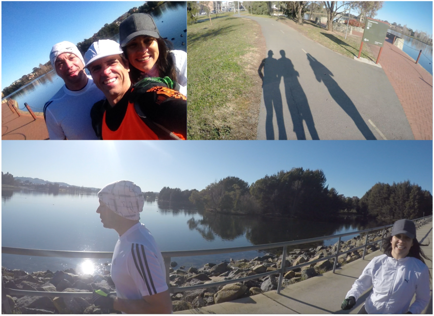 The temperature was still below zero when Marcele and I met Luiz, a friend of ours, at the neighbouring lake for the first 4 km of the marathon. Just before we started, I turned the RoadID app on my phone to let people track my run. As you’ll see, this step turned out to be very useful for those joining me later. Marcele, Luiz and I began our 4 km loop around the lake under freezing conditions and lots of ice still on the bike path. They deserve especial thanks for braving the Canberra cold to run with me.