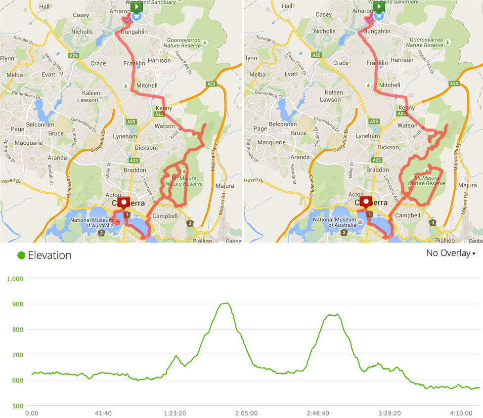On our way to the top of Mount Majura, I missed a left turn and instead of going up, we made an unplanned loop just to come back to the same point. The first of a few mistakes along the course (compare the planned and actual courses in the first figure). Later that day, I learned from my friend Renee that she was following me on the map when she noticed our mistake: “No Andre! Wrong way, wrong way!”, she even thought of texting me, but I guess that in the end she just decided to enjoy my path getting off the original plan.