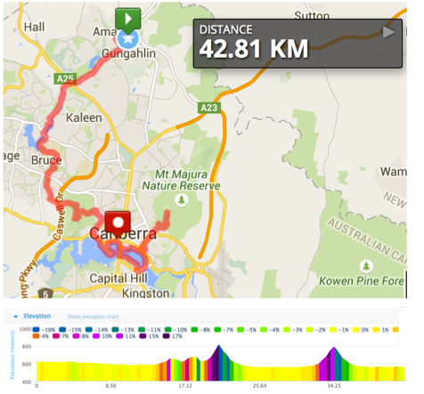 If there is one thing that I’ve learned after just two marathons is that there will be last minute changes to the course no matter how much in advance you plan it. It was like that in the first one and it happened again. My original plan was to run from Gungahlin to the Lake Burley Griffin climbing Black Mountain and Mount Ainslie. However, to make it easier for the runners who wanted to join me at different points of the marathon, I changed the map to the one shown on the left of the figure below.