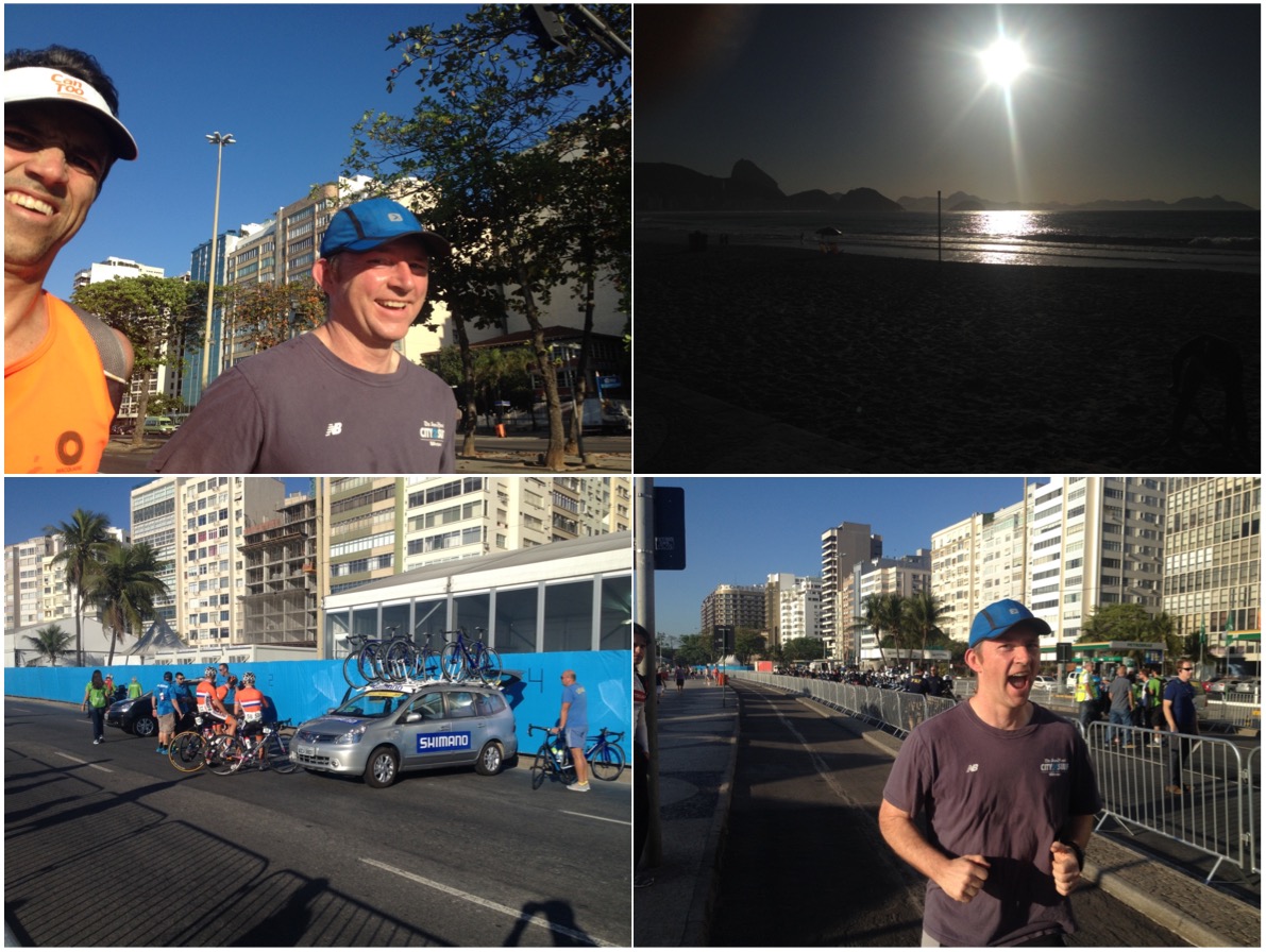Copacabana beach: us, the runners, the sunrise, the teams preparing for the road cycling event, and Joe posing. 🙂